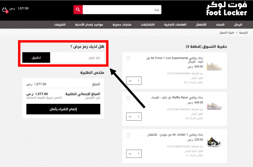 للحصول على الخصم، قم بنسخ كود خصم Foot Locker ثم لصقه في ملخص الطلب قبل إتمام عملية الشراء، وسيتم تطبيق الخصم فورًا على المنتجات المؤهلة.